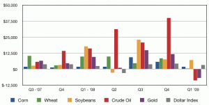 See how we did trading, corn, wheat, soybeans, crude oil, gold and the dollar index for Q1 of this year.