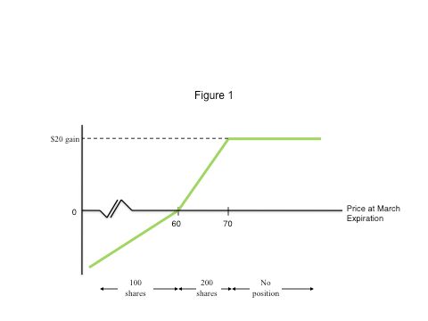 By combining these options with the 100 shares already owned, the trader creates a new position that gives double exposure between $60 and $70 to capture gains faster if his forecast is right. FIGURE 1 shows how the position functions if held until expiration.