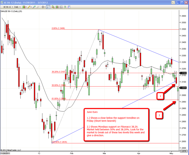 Since the start of 2012, the June Euro Currency has traded in a range between 126.35 and 1.3496. Most of the time, the price was narrowed into a range that was finally broken last week on Friday after the United States non-farm payroll disappointed. The lackluster report was combined with anticipatory selling ahead of elections in France. The drop in futures prices continued on Sunday night after France elected a member of the Socialist party into office for the first time in over twenty years. Surprisingly, the initial drop on Sunday night was short lived and technical trading took over. The chart below clearly shows the targets that the trade had in its sights.