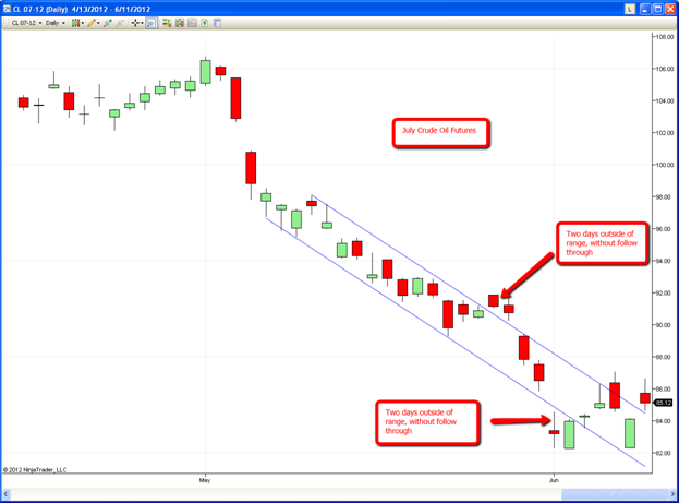 One of the identifiable themes for this chart is the range that Crude traded in throughout May (see blue trendlines on chart). There were four days in the month when prices closed outside of this range, and this is what I feel is most important to highlight.