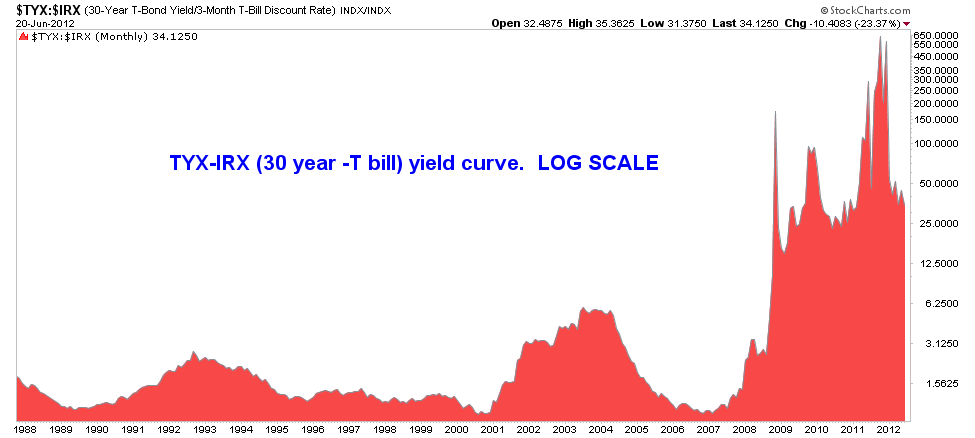 Above is a log scale (I normally use linear scale charts for their more literal view) chart of the 30 year yield vs. T bill 'yields' (so to speak). Due to extreme volatility, a linear chart obscures the message that the most extreme yield curve (until they introduce 50 and 100 year Treasury bonds perhaps?) remains elevated even after it was pressured downward after last year's kickoff to the euro crisis.