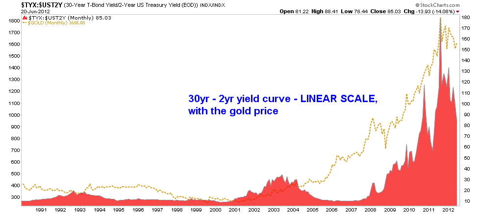 But what does Operation Twist do? It seeks to negate the natural forces (and thus the signals we derive) of the T bond market in favor of painting a handy picture. As for gold, the monetary barometer to systemic and inflationary pressure, it has - since the acute phase of the credit bubble implosion began in 2007 - tended to follow the spread between 30 year bonds and 2 year bonds.