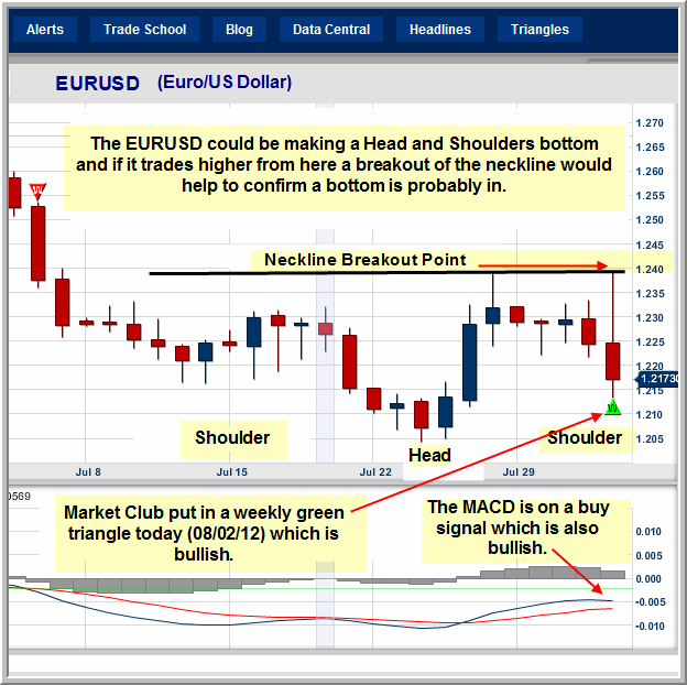 If the right shoulder holds above the head part of the pattern, and the EURUSD trades higher and moves above the neckline that will be confirmation that a trading low is probably in.