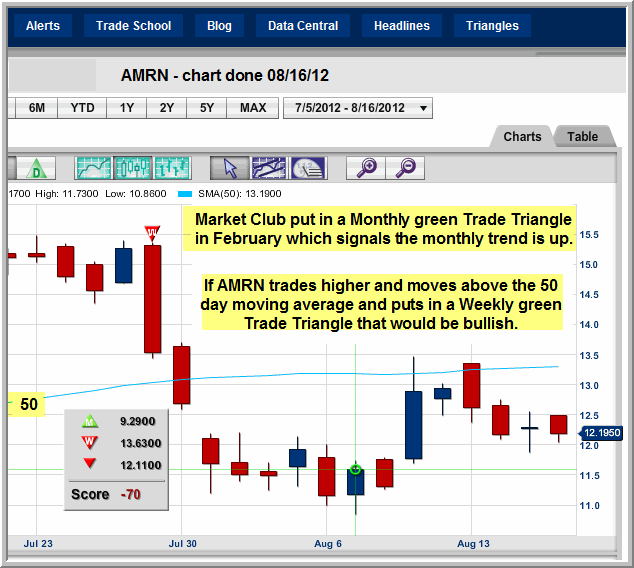 AMRN is in a long term up trend as MarketClub put in a Monthly green Trade Triangle in February 2012 (not shown on the chart).