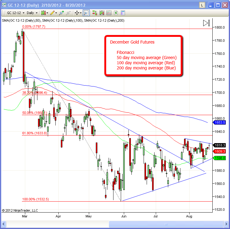 There is a FED announcement mid-week, and since the US Stock Indexes and Treasuries have hit their respective resistance and support, I believe that we will experience a bit of profit taking in quite a few markets that were directional last week. If the FED reports nothing this week, the profit taking may continue for more than just a few days. I still believe that the global markets will set their sights on the Jackson Hole Symposium in September before delivering a long term, directional trade. As far as Gold is concerned, I still believe the long term trend will continue to be up based on the underlying fundamentals and technicals. This week, look for another choppy trade with support levels at the 100 day moving (red line on chart) average at $1609, then the 50 day moving average (green line) at the ever important price of $1600 even. If these levels are violated, the market may target the cross of trendlines closer to a price of $1580. As far as resistance levels are concerned, the chart shows today’s high as the first resistance, based on the two week trendline above. If this level is broken, look for $1630 next, then the 200 day moving average (blue line) in the low $1650’s. Until Gold trades out these levels, traders should continue to take what the market gives them, which are fairly reliable technicals on the daily chart.
