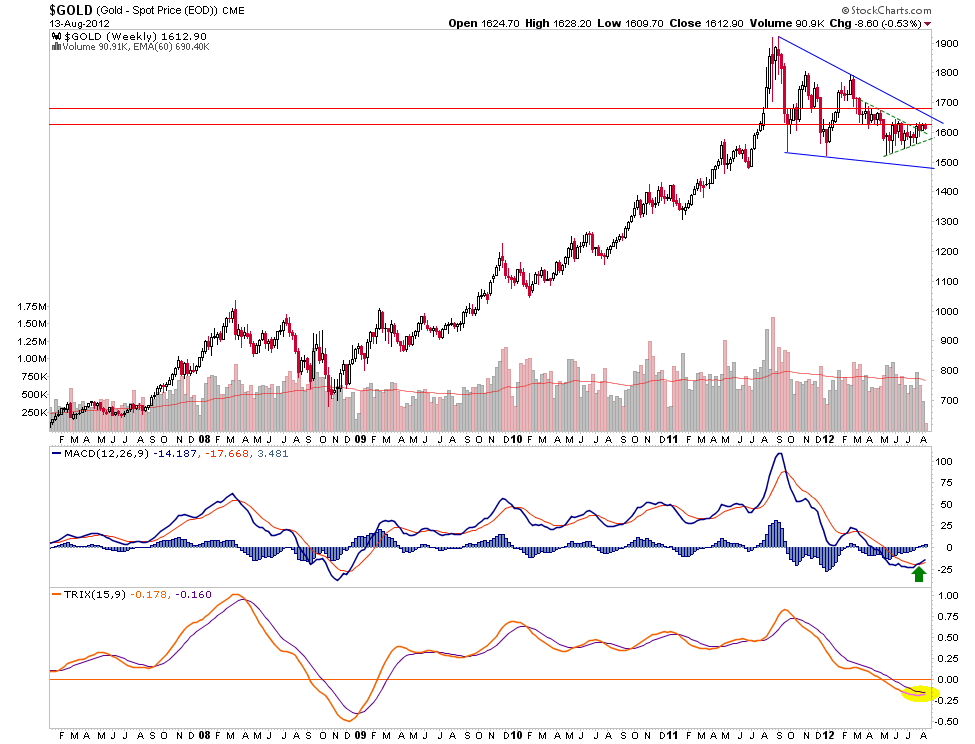 The corrective consolidation drags on, with weekly MACD on an up-trigger and a slower TRIX still in non-confirmation mode. The chart above is kept simple so that it is self-evident. Gold is dealing with resistance in the low 1600's with the upper blue downtrend line a key level for serious discussion of the correction's end.