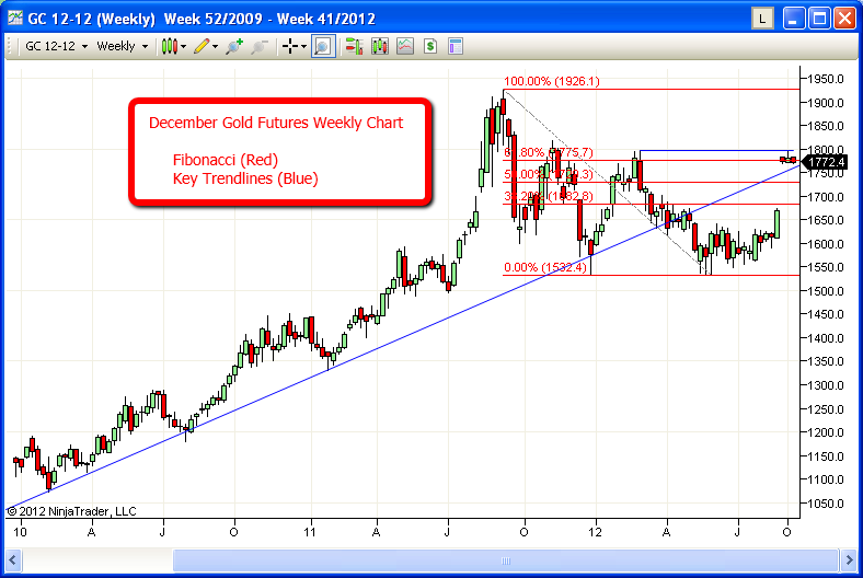 If you reference the attached chart, there is a multi-year trendline shown that comes into the chart slightly below the lows from the last three weeks. I believe that this line will hold this week as support. I do not expect Europe to cause any major waves in the market this week, or at all before the Unites States Presidential election. My thought is that any announcements that are made from Europe will continue to be seen as supportive. Not only will this help keep the Euro stable, it will also allow the FED’s QE3 participation to keep hold of the market and keep Gold prices underpinned. If there is unexpected great news out of Europe this week, I would expect Gold to retest last week’s high, and likely trade through $1800 an ounce. If the news is again lukewarm, expect prices to stay in the same range we have been in for over two weeks.