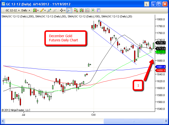 Last week the December Gold Futures were mixed as the market used both the 20day and the 50day moving averages as support. (See chart….20 day in black, 50day in green). So far this morning, there is a strong bid that appears to be targeting last week’s high near $1740. I believe that most traders will be waiting for the futures market to confirm a break above $1740 before committing to a bullish breakout. A failure at $1740 this week would send the market back to last week’s support levels again. If somehow there is heavy liquidation below the 50day moving average, the market would likely target $1680 where the former resistance trendline would now become support (arrow #1). I doubt there will be anything this week that would send the market below this price on the chart.