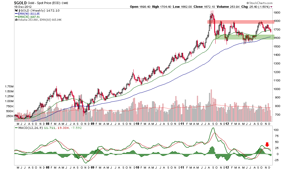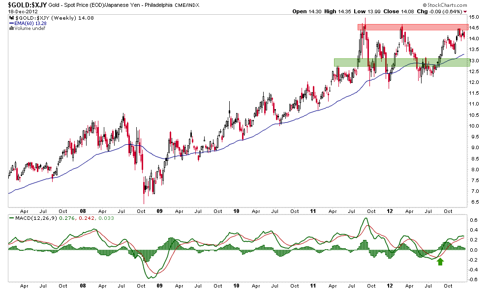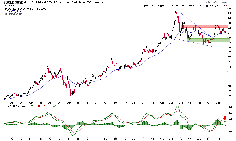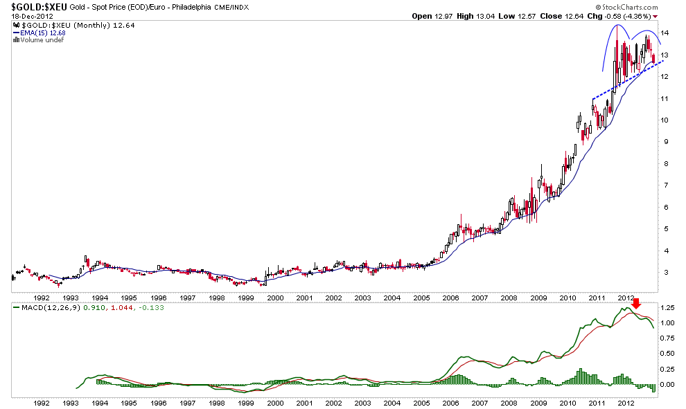 The monthly chart of Au in euros is not something I am in love with either. In particular, the toppy shape of MACD is concerning. According to noted currency analyst Ashraf Laidi: