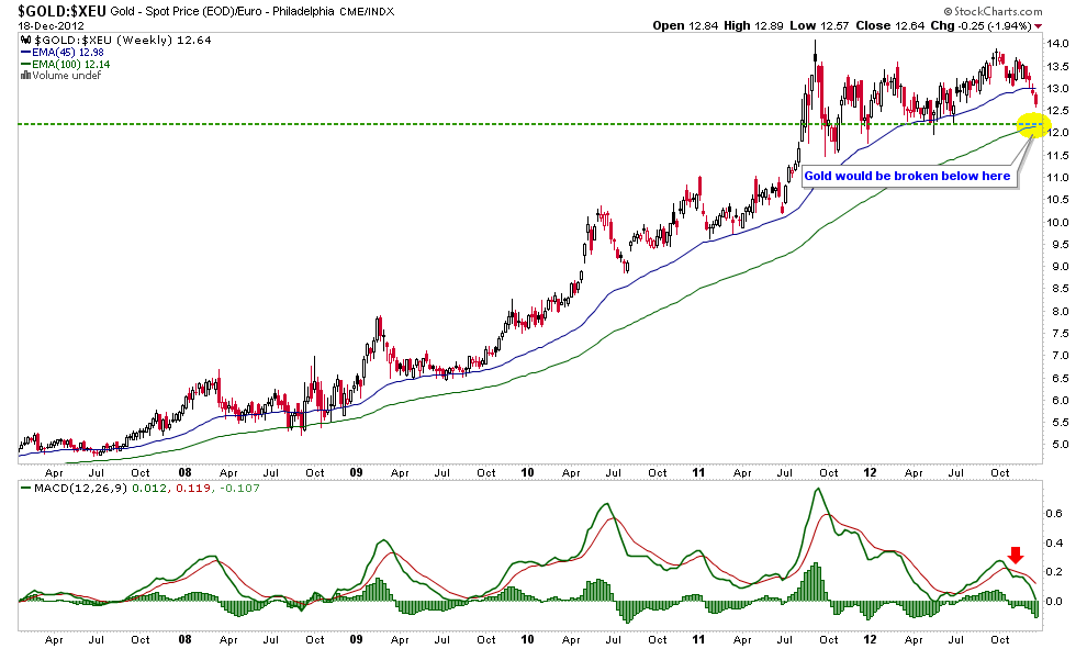 I am not going to pretend I like the chart of gold in euros. I do not care for it. But gold will be broken below the weekly EMA 100 and the green dotted line and not until.