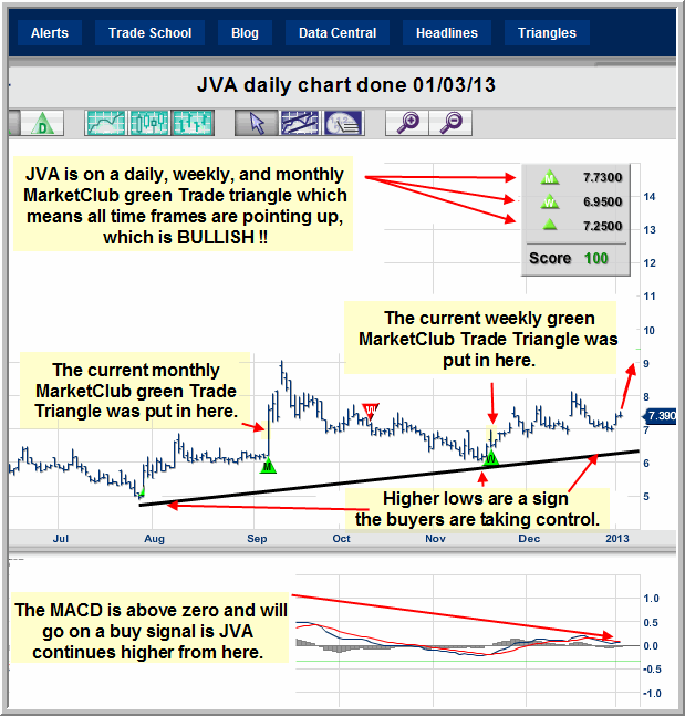 JVA is currently on a daily, weekly and monthly green MarketClub Trade Triangle and when all time frames are pointing in the same direction that is important information to have.