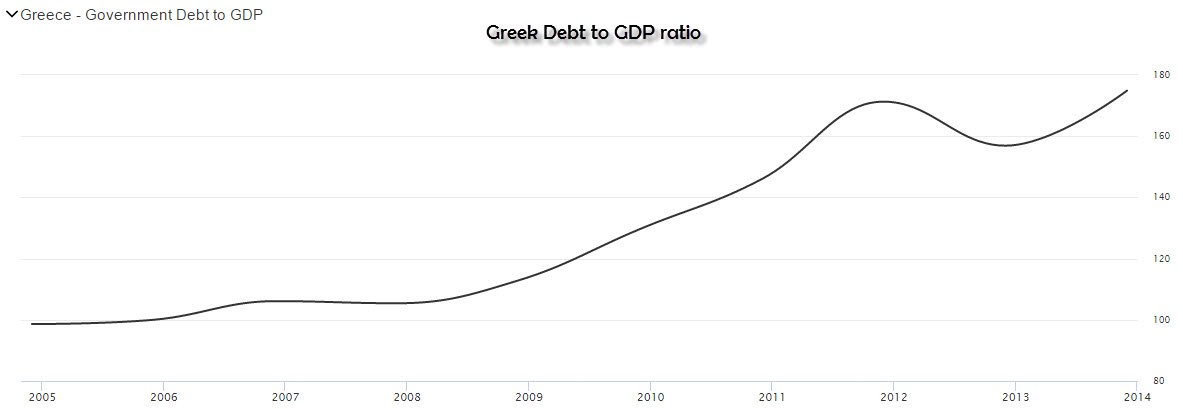 Cynics might say that theory is one thing while practice is another entirely. How can this history lesson guide us in gauging the path of the current tangled situation between Greece and the rest of the European Union, between the German finance minister Wolfgang Schäuble and the Greek finance minister Yanis Varoufakis? Unless Greek debt is viewed as the equal of German debt, unless Germany and other stronger members can guarantee that Greece will not leave debt holders with a haircut, Greece will always “cheat in minting its coin” and, as a result, Euros will be worth less and, eventually, the decoupling of Greek bonds and German bonds will leave no path except to a breakup. Given that, any haircut – in theory or in practice – will raise the risk of holding Greek debt vs German debt, which will only allow Greece to drift further away and endanger the European Union. Since the only chance for Greek bonds to near the yields of a Germany bond is through another bailout that may be the only option to fix the fractured trust. If Greek debt continues to grow, as seen in the path below, and if Greek bonds continue to trade as junk bonds (as surely will happen without a reliable bailout), the Euro as we now know it – perhaps not tomorrow or the day after or even within the next two years – will eventually end up just like the Latin Monetary Union, in the pages of history.