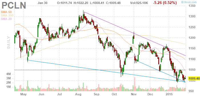 Priceline’s stock has taken a beating in recent months. After closing at $1,009.48/sh on Friday, shares of PCLN have already dipped by 11.6% in the first month of trading this year. On March 6th, 2014, shares peaked at $1,378.96/sh. Now, less than 11 months later, Priceline’s stock trades 37% below that price.