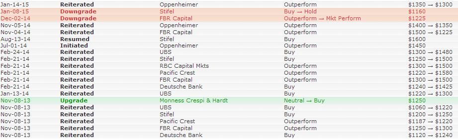 The 23 analysts covering the company have set a mean price target of $1,335.65/sh. This represents a 32% increase from PCLN’s currently quoted price.