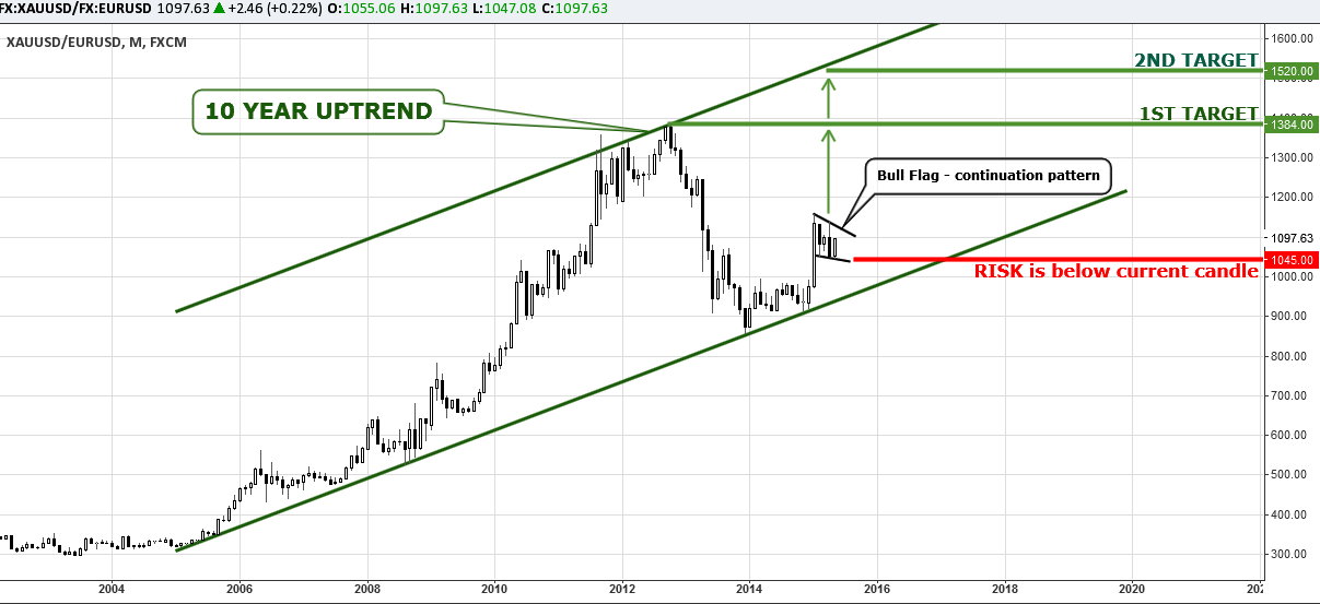 The trade setup is to buy Gold against the EUR at the current 1097 level (or keep your January long if you bought that time) with 1st target at 1384 EUR and the 2nd target located on the upside of the trend at 1520 EUR. The stop loss should be set below the current month candle (below 1040 EUR level). The risk/reward ratio (for the first target) is 1:5, very nice!