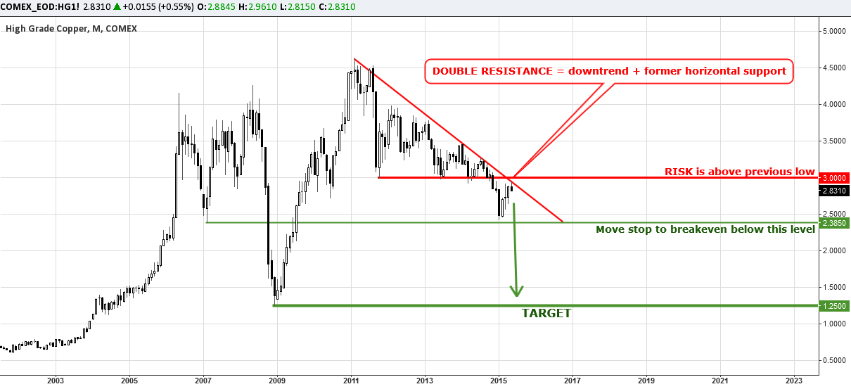 The trade setup is to sell Copper at the current $2.83 level (or keep short for those who sold earlier) with a stop above $3.03 and the target at $1.25 (as no more major supports are seen). The risk/reward ratio is huge, 1:8, enjoy the trade!