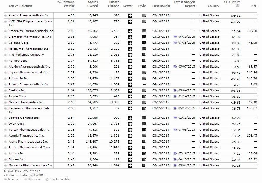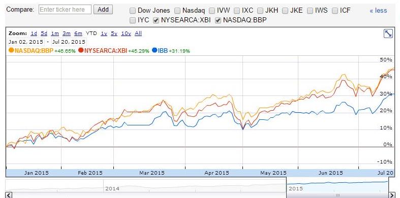 BBP may serve as a viable alternative to the traditional biotechnology ETFs via a pure biotech play with no holdings in the generic, specialty pharma, life science tools, medical device, diagnostic or other healthcare companies. Furthermore, this ETF focuses on the biotechnology cohort with at least one FDA approved product and thus potentially mitigating risk by default. BBP may offer a more refined biotechnology ETF portfolio that may translate into a superior formula to maximize the benefits while potentially mitigating risk due to its focus on commercial stage companies. Based on the nascent performance thus far since the launch of BBP in December of 2014, BBP has outperformed the red-hot IBB and XBI thus far in 2015. With an expense ratio of 0.85%, this ETF is pricy relative to the ETF universe however given the limited performance data this ETF provides high returns unrivaled by any major index including its counterparts, IBB and XBI. BBP may serve as a great satellite holding for any long portfolio desiring exposure to the biotechnology sector with a long-term time horizon.