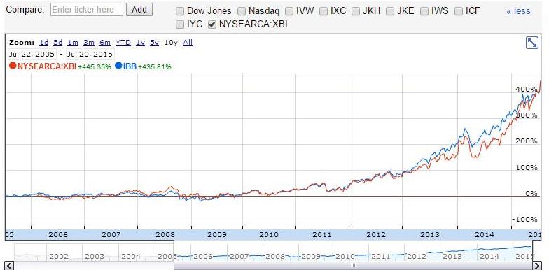Figure 3 – Google Finance graph showing the 10-year cumulative returns of IBB and XBI