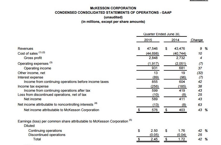 MCK has grown its revenues greater than 46% over a three year period from Q1 2013 through Q1 2015. During this 3-year time frame, MCK grew revenues from $122.196 billion in 2013 to $179.045 billion in 2015. From 2014 to 2015, revenue grew by a 30% clip while operating profit grew at a greater than 20% clip (Figure 1). Through the first six months of this year, revenue has grown at 9% compared to the first six months of 2014 and in addition to a nearly double-digit growth in revenue, net income increased by 43% (Figure 2).