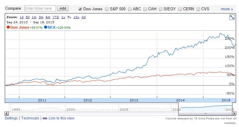 Figure 4 – Google Finance performance between MCK and the Dow Jones over the previous 5-year time period