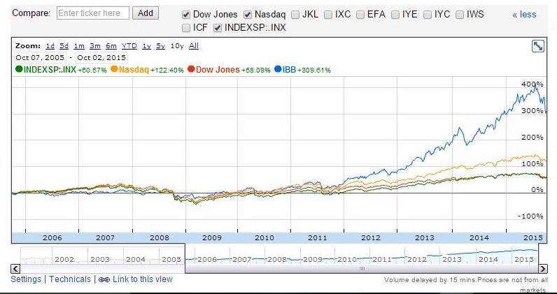 Figure 2 – Google Finance comparison of IBB returns relative to the S&P 500, Nasdaq, Dow Jones over the previous 10 years