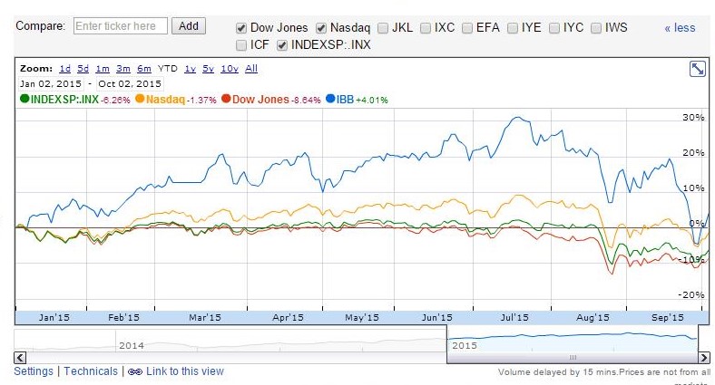 Figure 5 – Google Finance comparison of IBB annual performance thus far in 2015 relative to the S&P 500, Nasdaq, and Dow Jones
