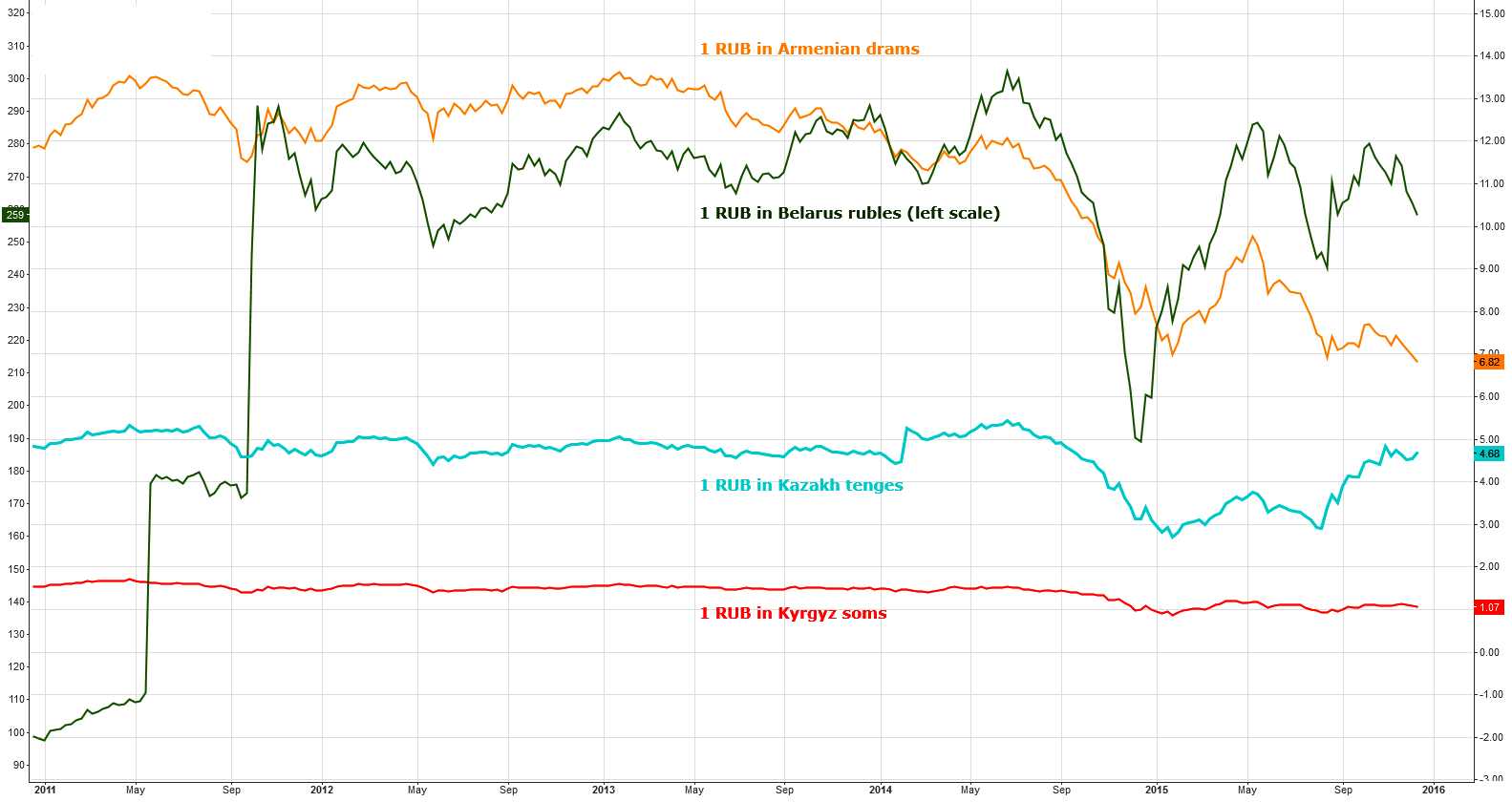 The RF pushes other EEU members to increase usage of local currencies in mutual trades and inside of the countries (property and car deals are priced and conducted in US dollars in most of EEU states except Russia). It is a hard task as severe devaluations on back of the falling oil price spurred the huge demand for dollars.