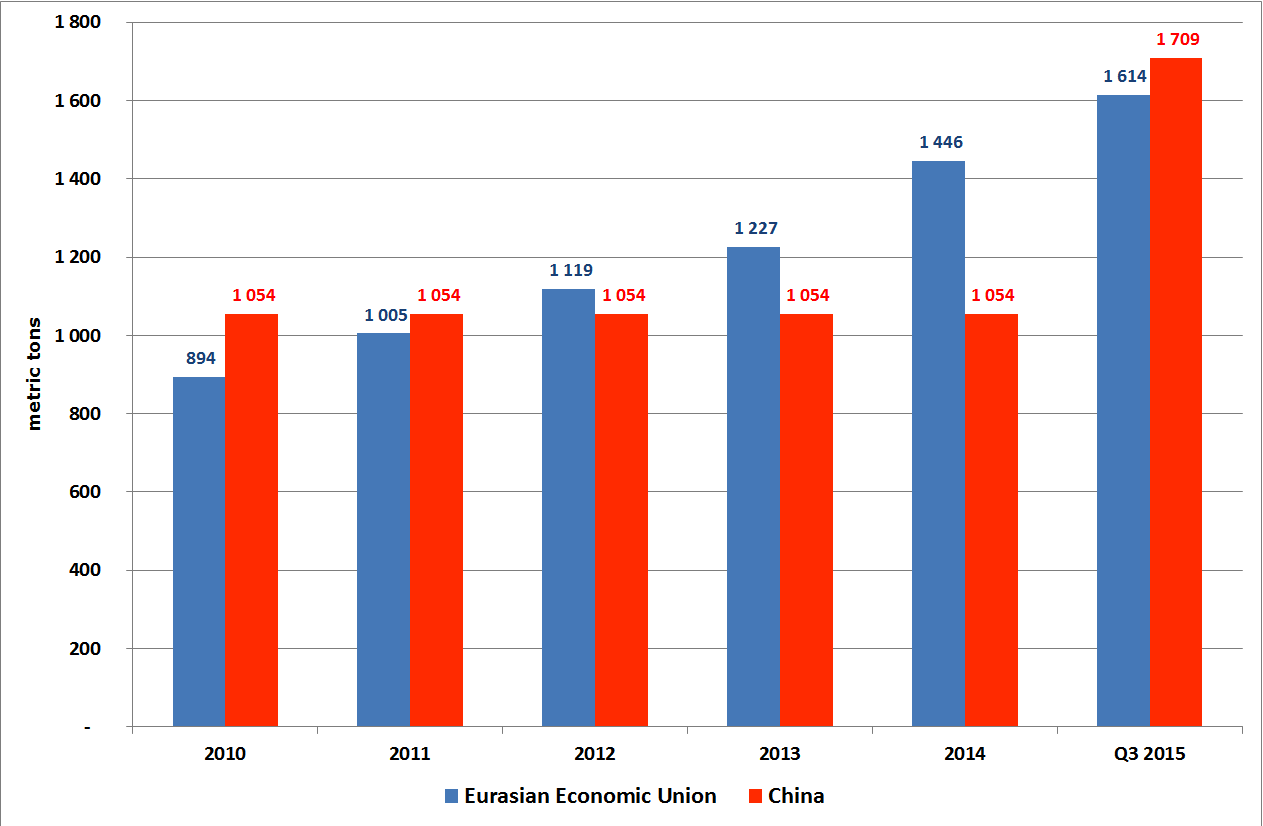 Chart 2. Comparative Dynamics Of Official Gold Holdings: The Eurasian Economic Union vs. China
