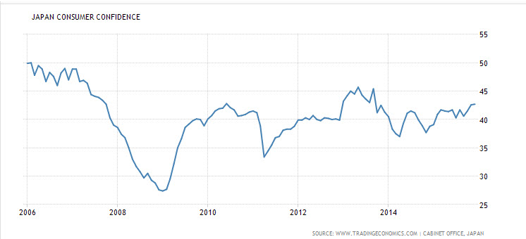 For example, Japan's consumer confidence index is stubbornly below 50 which signals subdued consumer spending. As can be seen in the chart below, things are not looking well. The figures point to a clear deflationary bias in Japan. That is especially true when we consider that savings, as a percent of GDP, is higher.