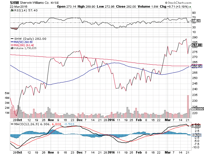 The recent purchase of Valspar will likely cost the company some short-term earnings but could provide investors with outsized gains in 12 months time. Short term value of the stock is at around $295 per share, a 5% gain, but with Valspar in its arsenal, this stock could easily rise well above $300.