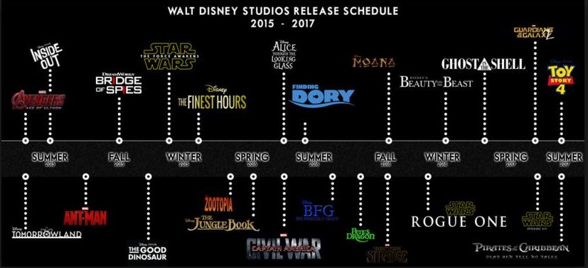 Disney has a rich pipeline with Star Wars themed parks, Star Wars movies, the opening of Disney Shanghai, Marvel movies, Pixar movies and future Disney movies such as Finding Dory to highlight a few. The deep movie portfolio and distribution schedule is highlighted below (Figure 1).