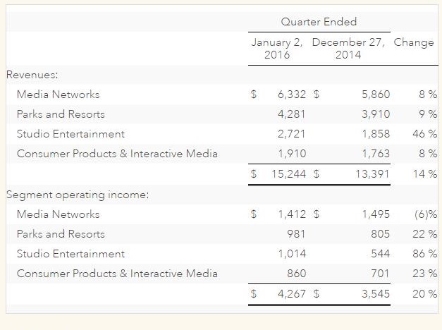 “Driven by the phenomenal success of Star Wars, we delivered the highest quarterly earnings in the history of our Company, marking our 10th consecutive quarter of double-digit EPS growth,” said Robert A. Iger, Chairman and Chief Executive Officer, The Walt Disney Company. “We’re very pleased with our results, which continue to validate our strategic focus and investments in brands and franchises to drive long-term growth across the entire Company.”