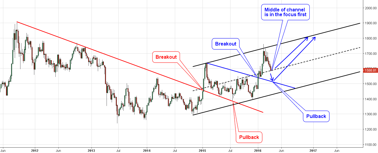 The first red breakout topped last February at the C$1635 level and then dropped back to the red trendline (former resistance). It touched the pullback area last July with a sniper’s accuracy and then the price bounced up. This is the perfect example of how a simple breakout technique works.