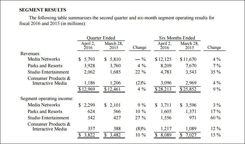 Disney released robust fiscal Q2 2016 results across the board albeit continued stagnation within its Media Segments division was reported. Overall, all major financial metrics (i.e. revenues, income and free cash flow) increased from the prior quarter and prior six month period (Figures 1 and 2). Comparing the two six-month comparable earnings periods, all metrics increased by double-digits with revenue coming in at a 9% increase.