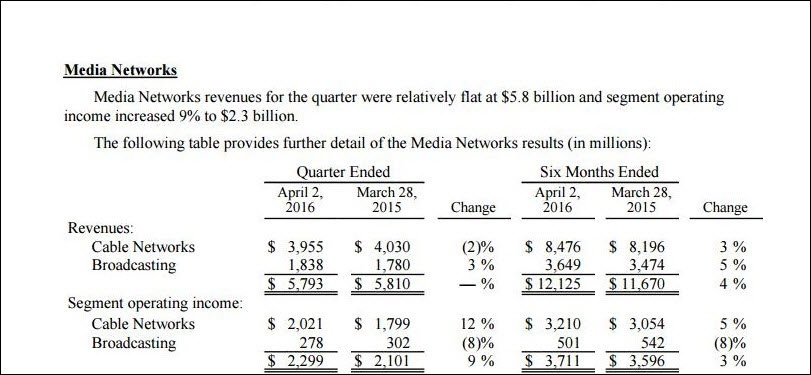 As Disney prepared to announce the most recent results and considering the above timing of ESPN broadcasting and Disney looking to monetize ESPN via alternative means, I’ll was looking for a capitulation in the ESPN decline and further acceleration in other segments. This appears to be the case as Media Networks posted a flat revenue number on a quarterly basis while over the same six-month period last year, revenue in this segment increased by 4% and operating income increased 3%.