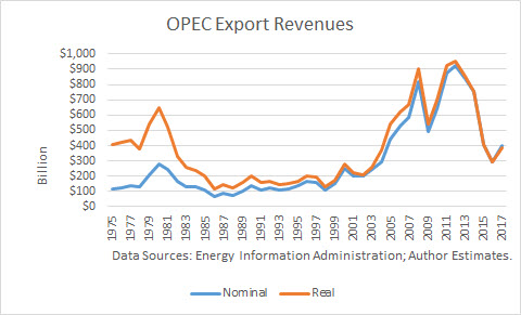 The EIA had estimated that OPEC export revenues in 2015 had declined by 47% in 2014, totaling $404 billion. Its report in June, it estimated that export earnings would drop to $341 billion in 2016. Adjusting for inflation, this would be the lowest annual level since 2003.