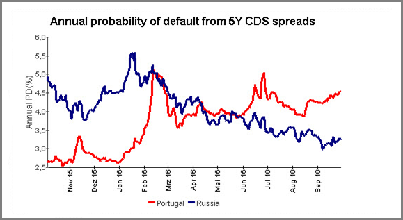 But perhaps the worst banking crisis is brewing in Portugal. According to the Financial Times, Portuguese banks are in dire need of capital and, even more worrying, Portugal’s banking crisis is weighing heavily on the creditworthiness of Portugal’s government which might, in fact, be forced to rescue the distressed banks. Certainly, Portugal’s anti-austerity government isn’t doing much to bolster investors’ confidence. Investors’ fears over Portugal have recently escalated so much that Credit Default Swaps, an important gauge of credit risk, are pricing in a sovereign default of Portugal as more likely than even Russia, with its battered economy.