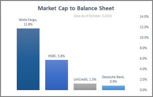 In the chart below we have divided the market capitalization of some of the largest banks in the world compared to their balance sheet. The lower the ratio, the less capitalized the bank. In other words, the bank’s equity is smaller than the liabilities on its balance sheet; therefore, the bank has many underperforming loans which would need to be written off. It also means that if the bank does write off the bad loans then perhaps it will have insufficient capital to operate. The comparison of Deutsche Bank, Germany’s largest bank and UniCredit, Italy’s largest bank, to Wells Fargo in the United States or HSBC in the United Kingdom underscores the severity of the problem. While Wells Fargo’s market capitalization is roughly 12% of its balance sheet and HSBC’s market capitalization is 5.8% of the total balance sheet, Germany’s Deutsche Bank is less than 1%, and Italy’s UniCredit is barely above 1% at 1.3%.