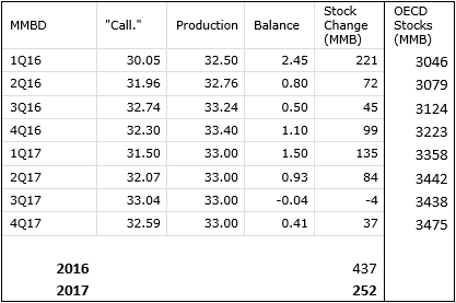 OPEC provides world supply-demand numbers that result in a “call” on OPEC oil. It is the difference between world demand and non-OPEC supply. As shown quarterly in the table below, I provide historical as well as expected supply, demand, and stocks, assuming OPEC production at 33 mmbd in 2017. Based on OPEC’s numbers, there would be a seasonal supply-demand balance in 3Q17, but overall, stocks would still rise by about 250 million barrels. In my opinion, this might enable WTI crude futures prices to stabilize around $50 per barrel.