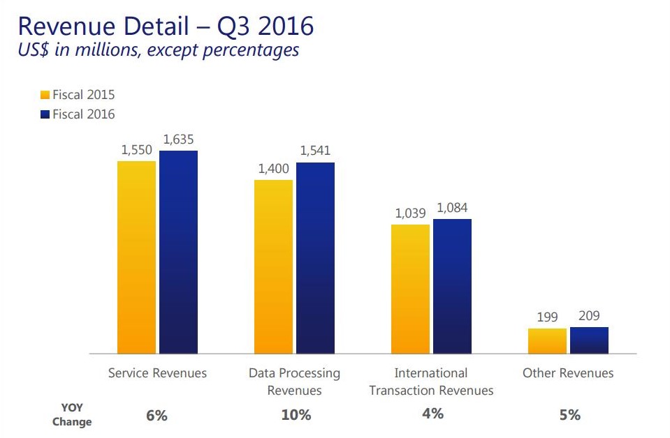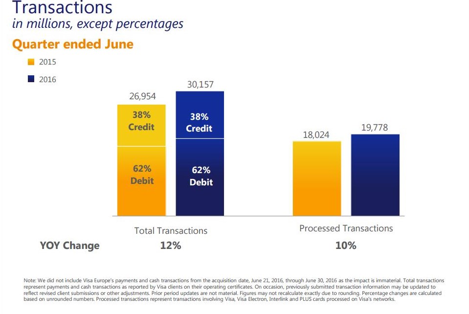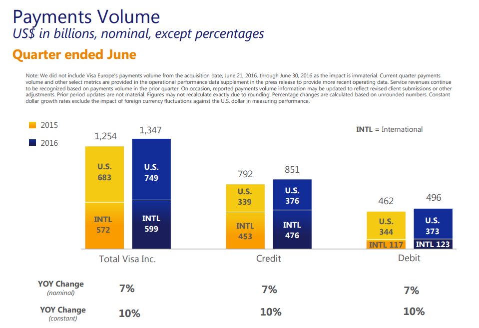 Visa recently announced Q3 2016 results with net operating revenues of $3.6 billion (up 3% over prior year), cash and equivalents of $12.4 billion and free cash flow of $2.0 billion. Some major growth highlights from the most recent earnings announcement can be seen in Figures 1 through 4. In brief, gross revenue increased to $4.469 billion year-over-year or 7% increase (Figure 1). Visa posted growth across all revenue segments from Service, Data Processing, International Transaction and Other by 6%, 10%, 4% and 5%, respectively (Figure 2). In terms of payments volume, Visa posted a 7% growth rate overall with an identical growth rate for both credit and debit cards (Figure 3). Total transactions increased at a healthy rate of 10% across the business (Figure 4).