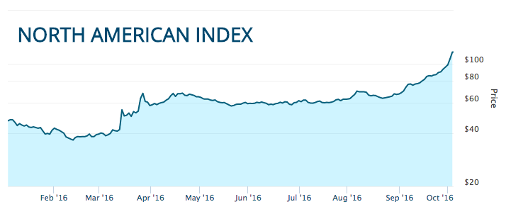 In the meantime, the MJIC North American Marijuana Index, an index that tracks the performance of 39 North American marijuana stocks, is up more than 100%. Take a look at the chart below.