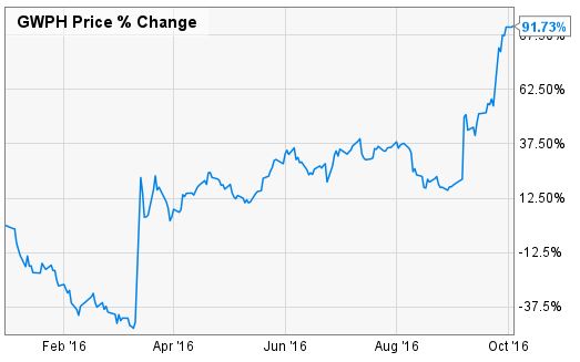 Although that research had long failed to lead to any commercial breakouts, that changed in 2014 when Phase III clinical trials showed one of its marijuana-based drugs helped reduce epilepsy. Today, GW is on pace to complete four Phase III trials for marijuana-based pharmaceuticals by 2017. The market is clearly expecting good news. Shares of GW are up 91% in 2016.