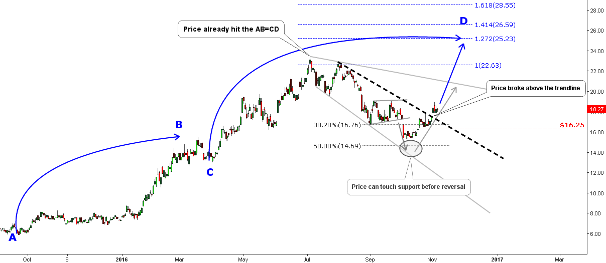 The assumed drop in the price after consolidation proved to be right as highlighted by the gray arrows, the price almost reached the downside support and stopped above the 50% Fibonacci level at $14.69. The reversal also went up by direction of the earlier put arrow.