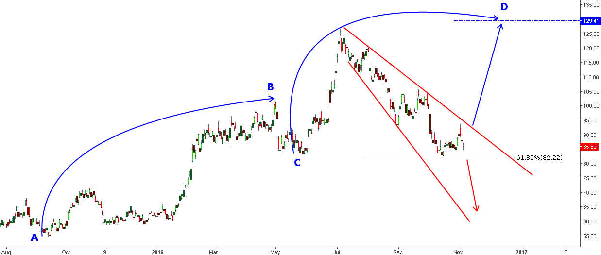 The Randgold chart shows a totally different story compared to ABX. It has a sharper angle of the drop in consolidation and hence the deeper level of correction, which dragged down the stock in the comparative performance chart (Chart 1). The price reached the 61.8% Fibonacci retracement level at the $82 level. Then we saw a quick reverse upside, which scored almost $12. But it was short-lived strength; the stock couldn’t break above the resistance line and the GOLD (Randgold) dropped down losing almost all gains.