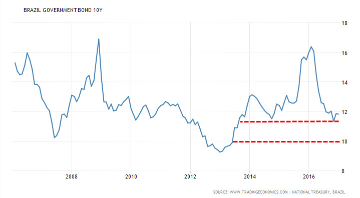 The risk over Brazil still looms. Especially given that, after such a recovery, profit taking is generally the norm and because Brazilian politics tend to be so unpredictable. Yet, we could draw some important conclusions from activity in the Bond market and from monetary policy. Yields for Brazilian 10-year bonds face support around 11%, and that holds the potential for a jump in yields, especially if the Fed moves to tighten three times in 2017. But, if yields break below the 11% and the 10% barriers, that would signal that yields in Brazil are coming down to normal levels. It would also emphasize that investors expect the Central Bank of Brazil to maintain its vigilance against inflation and essentially keep up with the Fed’s tightening by moving with its own tightening. That will signal, above all else, that Brazil has turned a corner and moved back to growth.