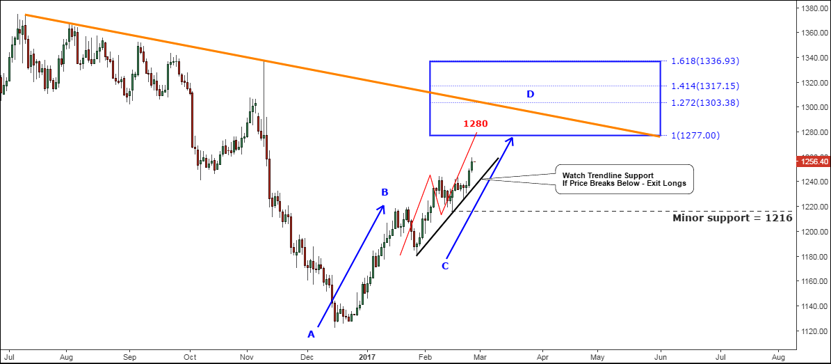 The range for the D point is set within the $1277-1336 range using the Fibonacci ratios (1-1.272-1.414-1.618) as highlighted in blue rectangle in the chart above. The first target is just $21 away from the market close. The next target at $1303 level (ratio = 1.272) is located right in the mentioned above double resistance area where the orange trendline and the previous consolidation area cross. The other targets reflect the breakup of the orange trendline.