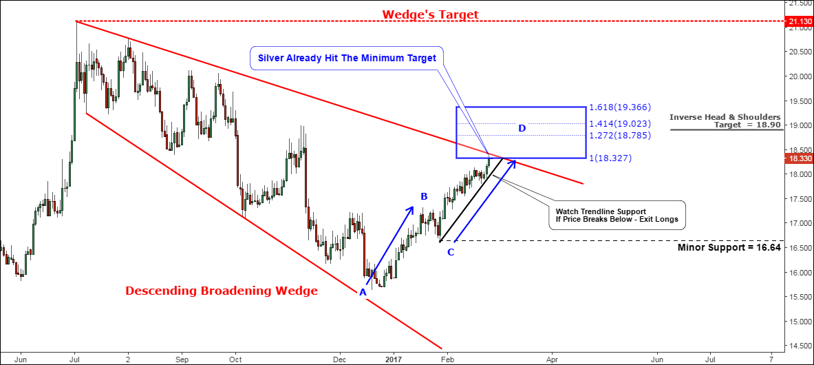 This top metal was the first to break out of consolidation and the first to reach the strong resistance (red). Besides that, it came the first to the minimum target at $18.33 level, which was set for the D point where the CD=AB segment.