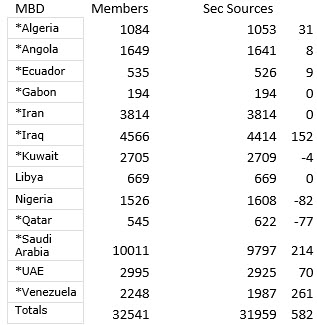 But the members own figures for February turned out to be 582,000 b/d higher than those submitted by secondary sources, as shown below. (Iran, Libya and Gabon did not submit their own figures.)