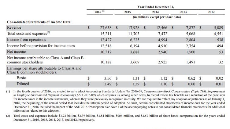 Figure 1 - Facebook's year end growth numbers from 2013 through 2016
