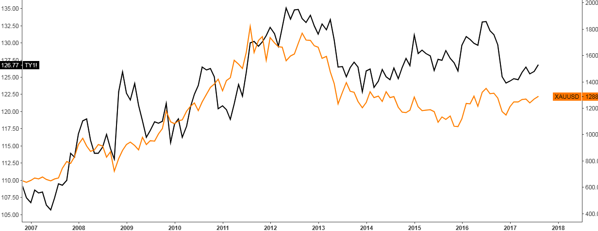 Both UST and the gold are the haven instruments where investors could wait out the market storms. It should be quite natural that these instruments have a good correlation between each other. To show it, I posted the chart above, which covers 10 years of the price history of gold (orange, right axis) and the UST (black, left axis).
